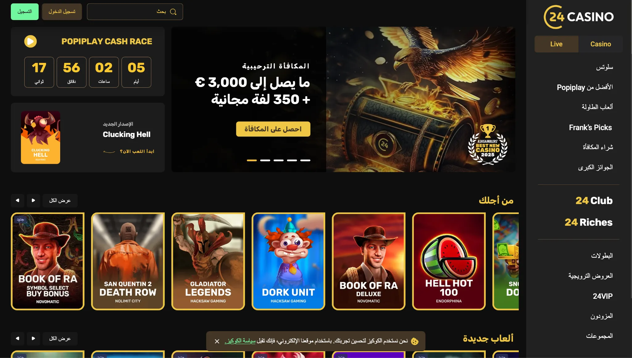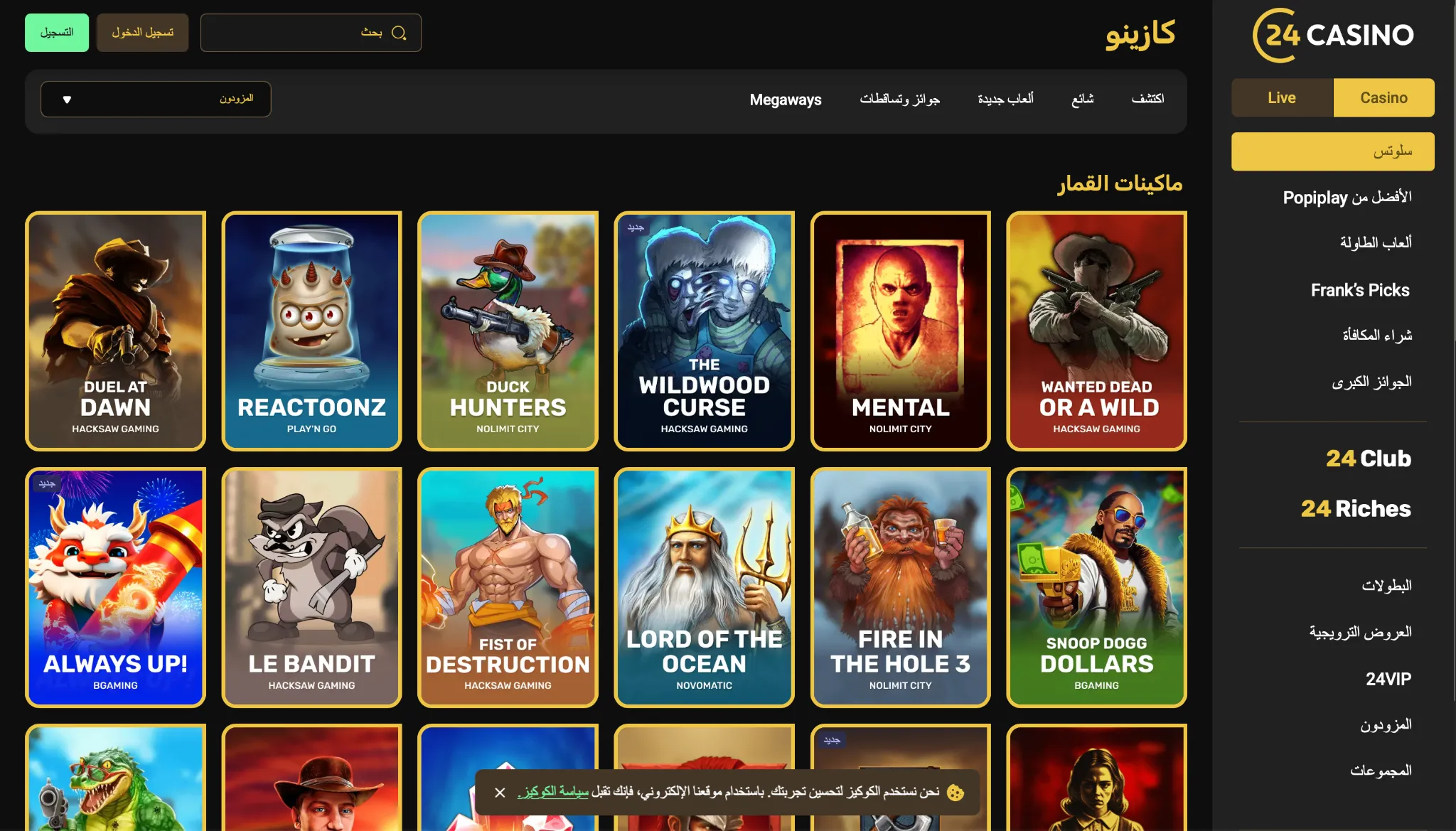 - تصميم كازينو حديث: يتميّز كازينو 24casino بواجهة أنيقة وسلسة تعكس مواكبته لأحدث صيحات عالم المقامرة عبر الإنترنت. تتيح هذه المنصة أيضاً تجربة مستخدم سلسة عبر مختلف الأجهزة الذكية، سواء المحمولة أو المكتبية.