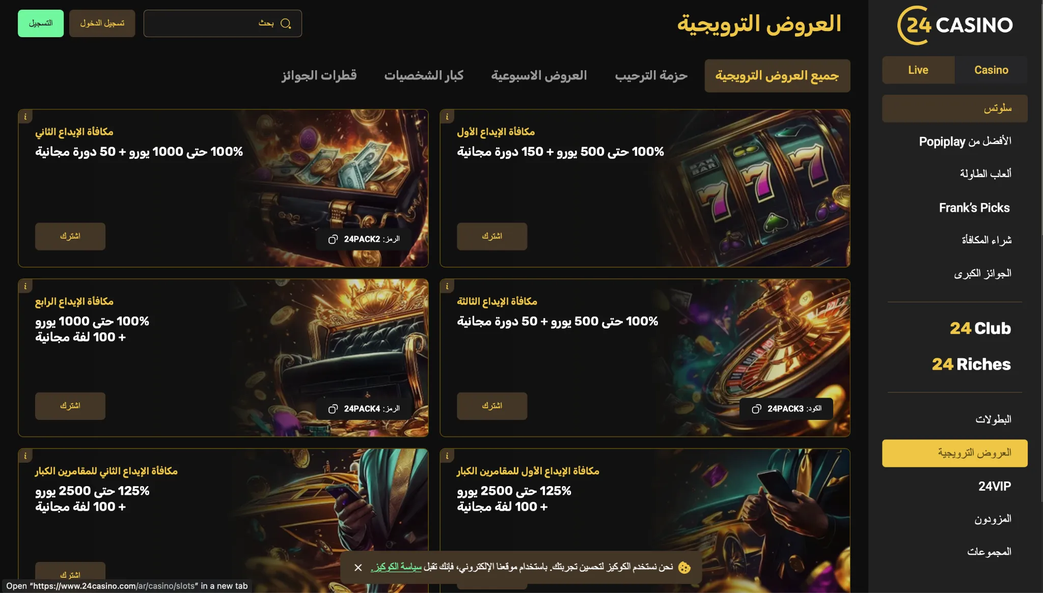 تساعد عروض المكافآت في كازينو 24casino في الدول العربية اللاعبين بشكل كبير على تعزيز حظوظهم في تحقيق الأرباح والاستمتاع بتجارب مقامرة ممتعة. في كازينو 24casino، تتوفّر للاعبين حزمة ترحيبية سخية يتم تقسيمها على الإيداعات الأربعة الأولى، إضافةً إلى العديد من العروض الترويجية المنتظمة.